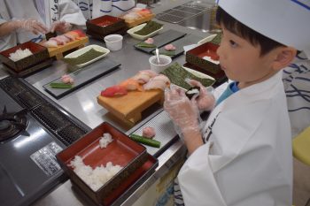 ▲「今日から君も寿司職人!鹿児島のお魚で寿司をにぎろう!」回転寿司店『寿司まどか』を運営する康正産業株式会社様による寿司職人体験講座を行いました。地産地消やフードロス削減について学んだ後、実際に鹿児島の魚を使って寿司をにぎりました。魚の解体ショーもあり、ボリューム満点の内容でした。参加した方からは、「魚の命をいただいているということも改めて感じることができ、普段みれない魚のさばき方など全てが勉強になりました」という声がありました。