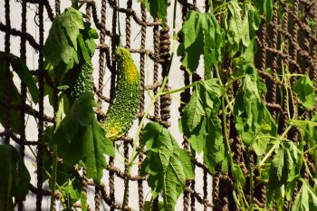 未来館の西側には、にがうりのグリーンカーテンがあります。今年もすでに何回か収穫しましたが、まだまだ実っています。濃い緑色をしたもの、少し黄色がかっているもの、完熟して鮮やかなオレンジ色になり、はじけて種がでてきているものなど、様々なにがうりたち。