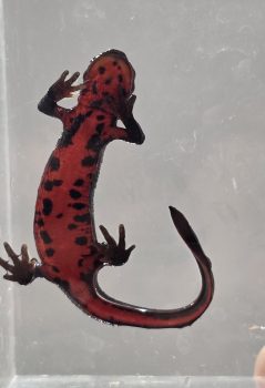 真っ赤なおなかに黒い模様が印象的なアカハライモリですが、実はこの模様は1匹1匹みんな違うんです。この模様は地域差で特徴があるそうですが、未来館にいる子はどんな模様をしているのでしょうか。