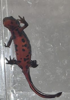 1匹目の子とは違い、左右に模様が分かれているように見えますね。3匹の中で一番おなかの赤が濃く鮮やかな子です。
